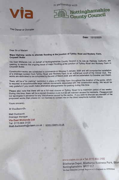 We have received an update from VIA about resolving the drainage problem at Rookery Corner (the junction at the bottom of Tythby Road into Cropwell Butler) which has caused so many problems with repeated flooding over the last couple of years. They have now commenced work and have provided us with a schedule of the forthcoming plans. There may be some disruption at Rookery corner over the coming 12 weeks. See the information letter below received from VIA about the work. We have been in contact with Matt Duckworth who is the drainage manager for VIA East Midlands for more specific information. He has advised that there will be a complete road closure at Rookery Corner to Tythby Road for a period of two weeks which will be sometime between the beginning of March and the middle of April. He will keep in touch with us to give us a more accurate date and we will keep you all informed. Access to Millfield will need to be via the Tythby village direction for the two week period and we will email a route map nearer the time to show the route you will need to take. Via have apologised for any inconvenience caused to us, but it is vital that the drainage work is completed so that the flooding problem is finally resolved.